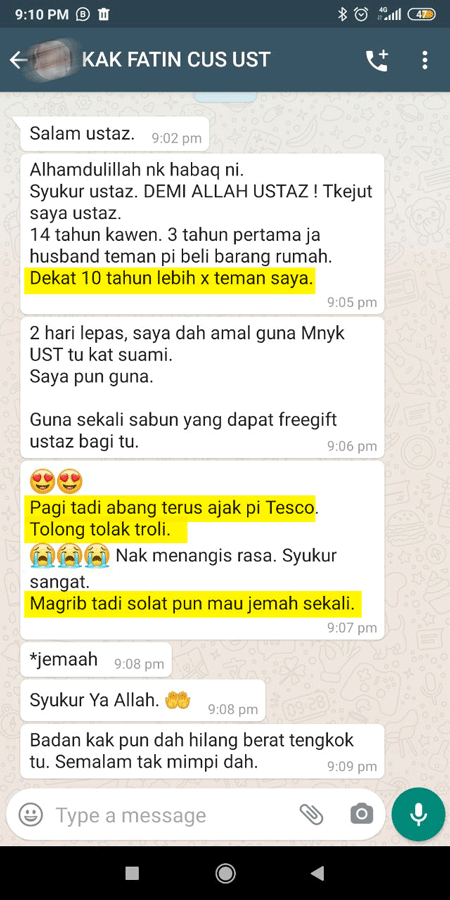 Lepas guna UST OIL Ustaz Abdullah ni, banyak sangat perubahan dalam hidup. Berniaga makin lancar, hubungan suami isteri dah tak macam dulu-dulu. Abg haji pun sampai ajak pi umrah sama-sama.